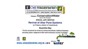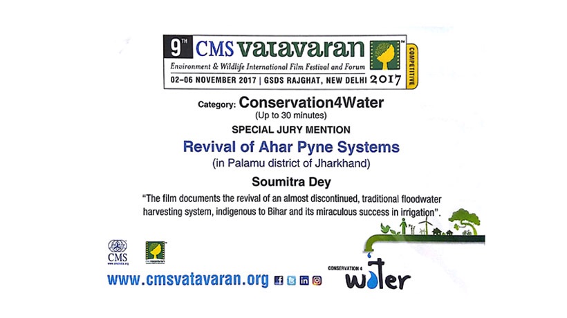 'Revival of Ahar Pyne Systems (In Palamu district of Jharkhand)' directed by Soumitra Dey, was screened in 'River Film Festival on the occasion of Ganga Utsav 2020' on November 2nd, 2020. This festival was held by National Mission for Clean Ganga (NMCG) in collaboration with CMS Vatavaran.